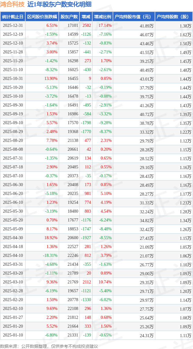 从股价来看,2025年12月19日至2025年12月31日,鸿合科技区间涨幅为6.51%,在此期间股东户数增加2502.0户,增幅为17.14%。